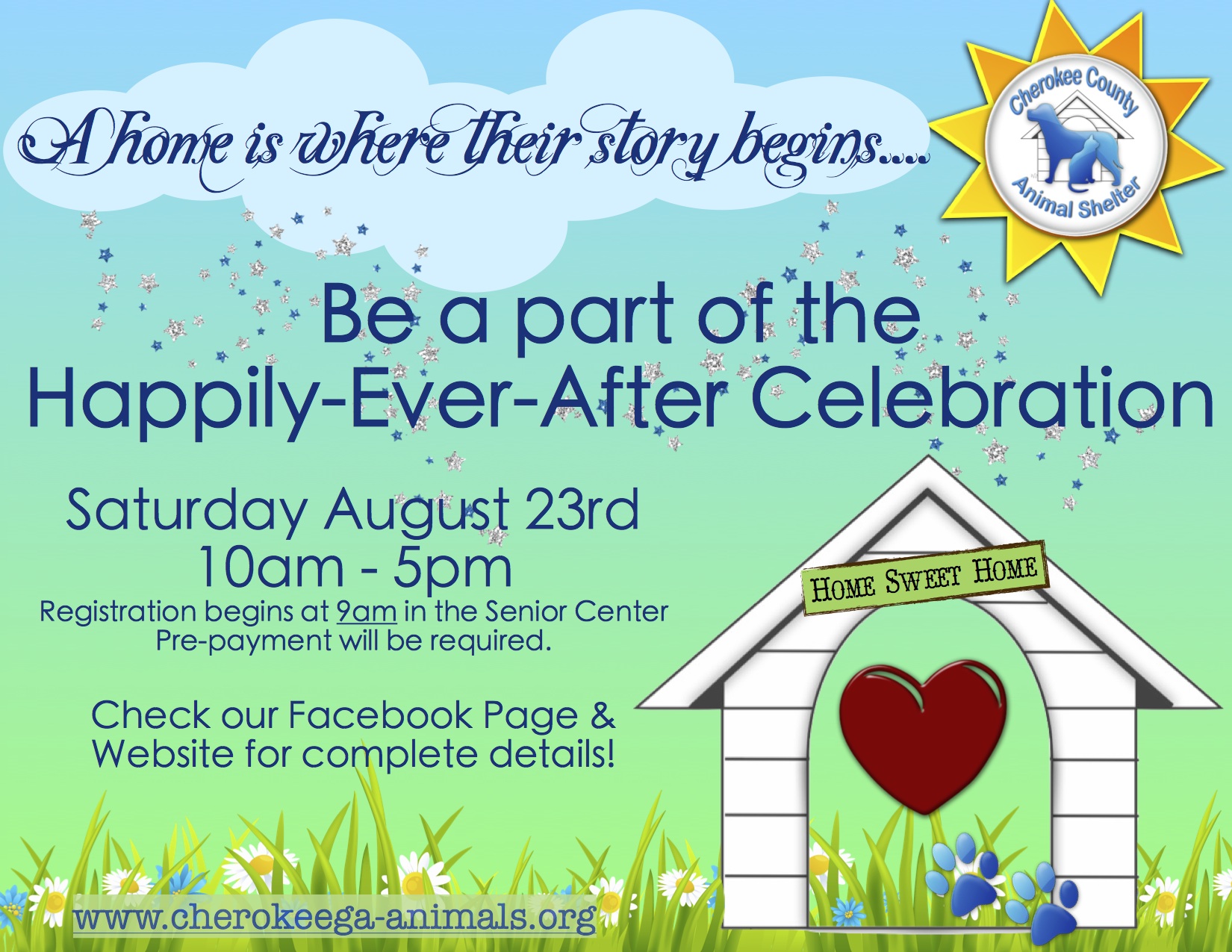 Cherokee County Animal Shelter would like to announce that it is time for a HAPPILY EVER AFTER CELEBRATION for the dogs in our current emergency situation. Because a home is where their story begins, we are planning the adoption event of a lifetime for Saturday, August 23rd. Registration will begin at 9am in the Senior Center Building, adjacent to the shelter, and pre-payment of a $100 adoption fee will be required. Only one adoption will be allowed per household and chaperones will escort about a dozen individuals/groups through the adoption kennels at a time to match each pet with the family that will provide its home sweet home.